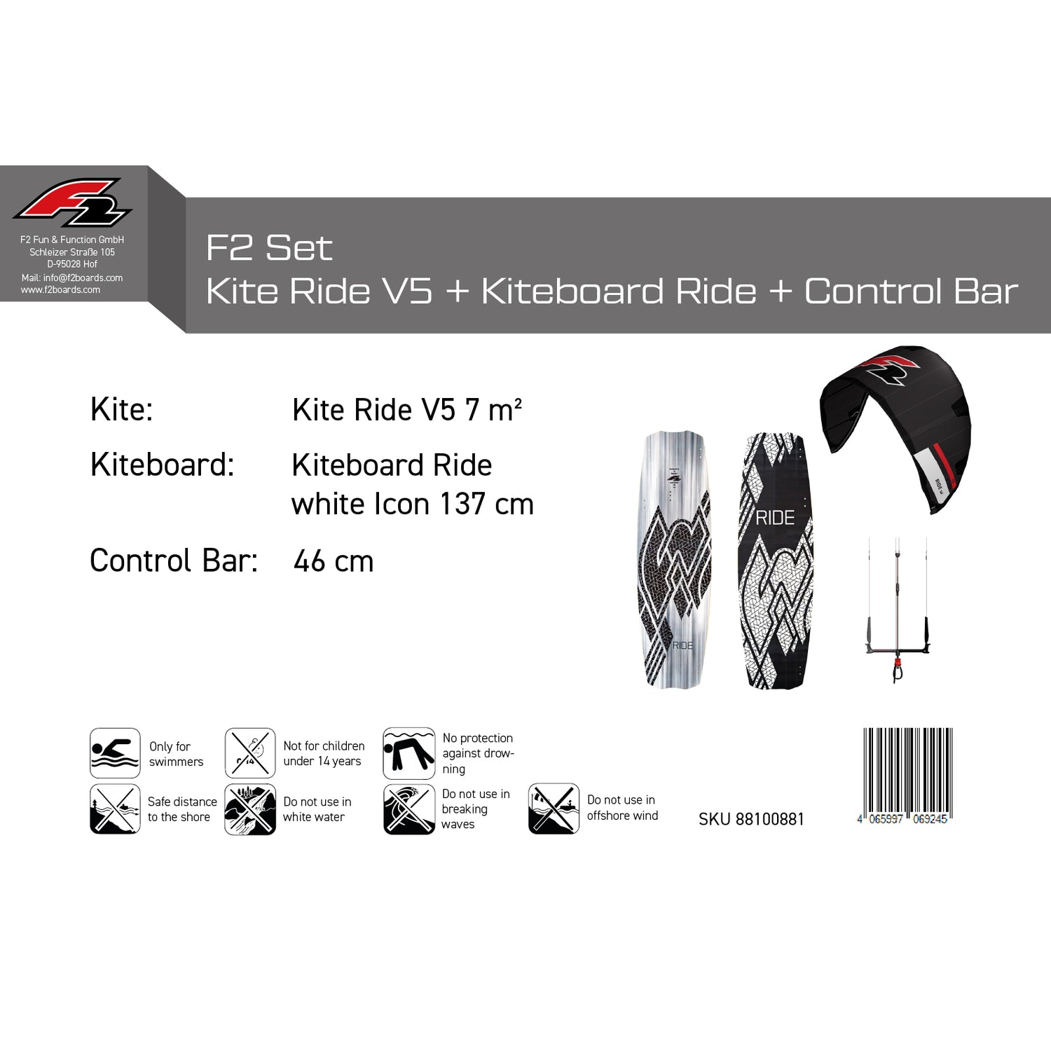 F2 Set Kite Ride V5 mit Kiteboard Ride White Icon und Control Bar Komplettset Größen wählbar