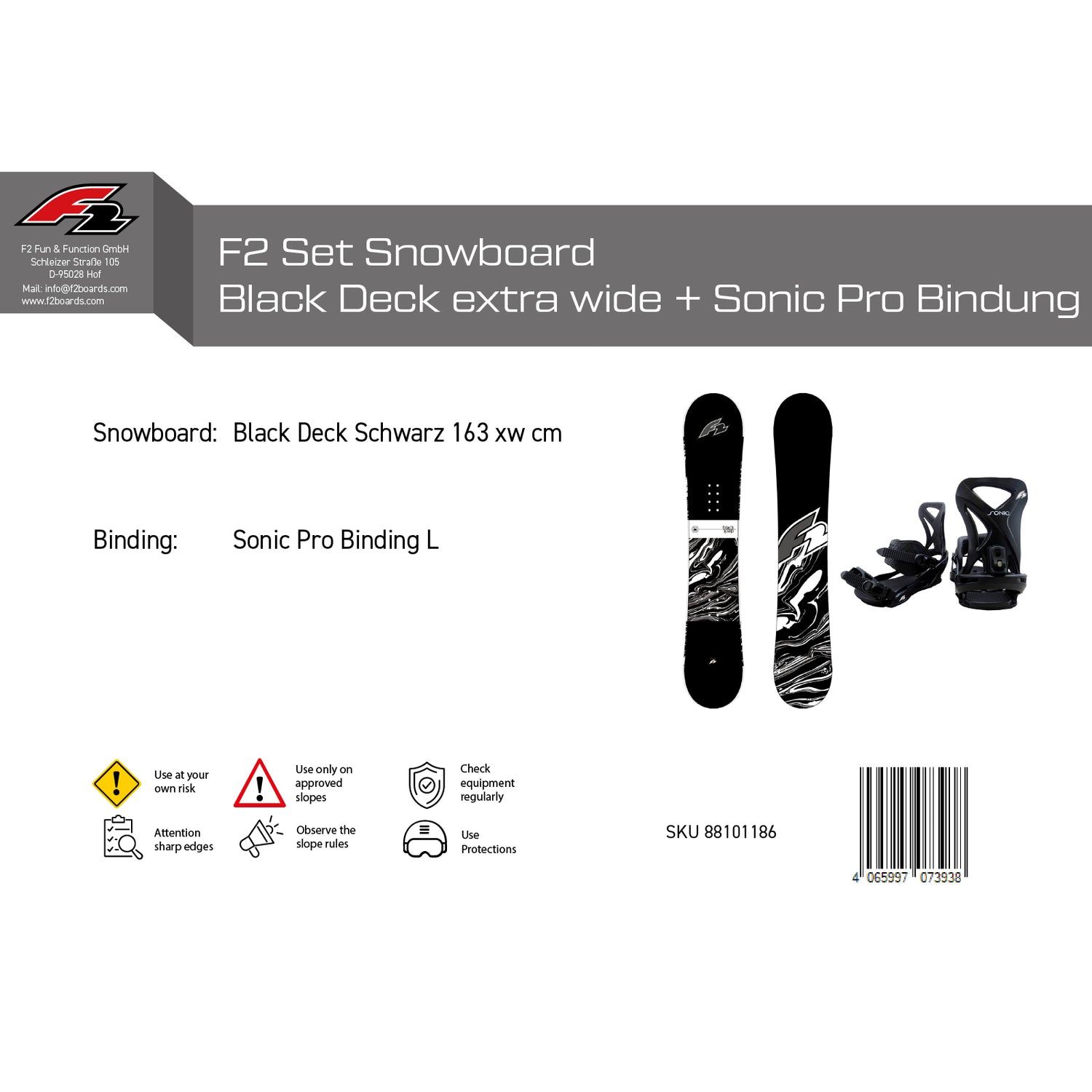 F2 Set Snowboard Blackdeck Schwarz + Sonic Pro Bindung - Komplettset Größen wählbar